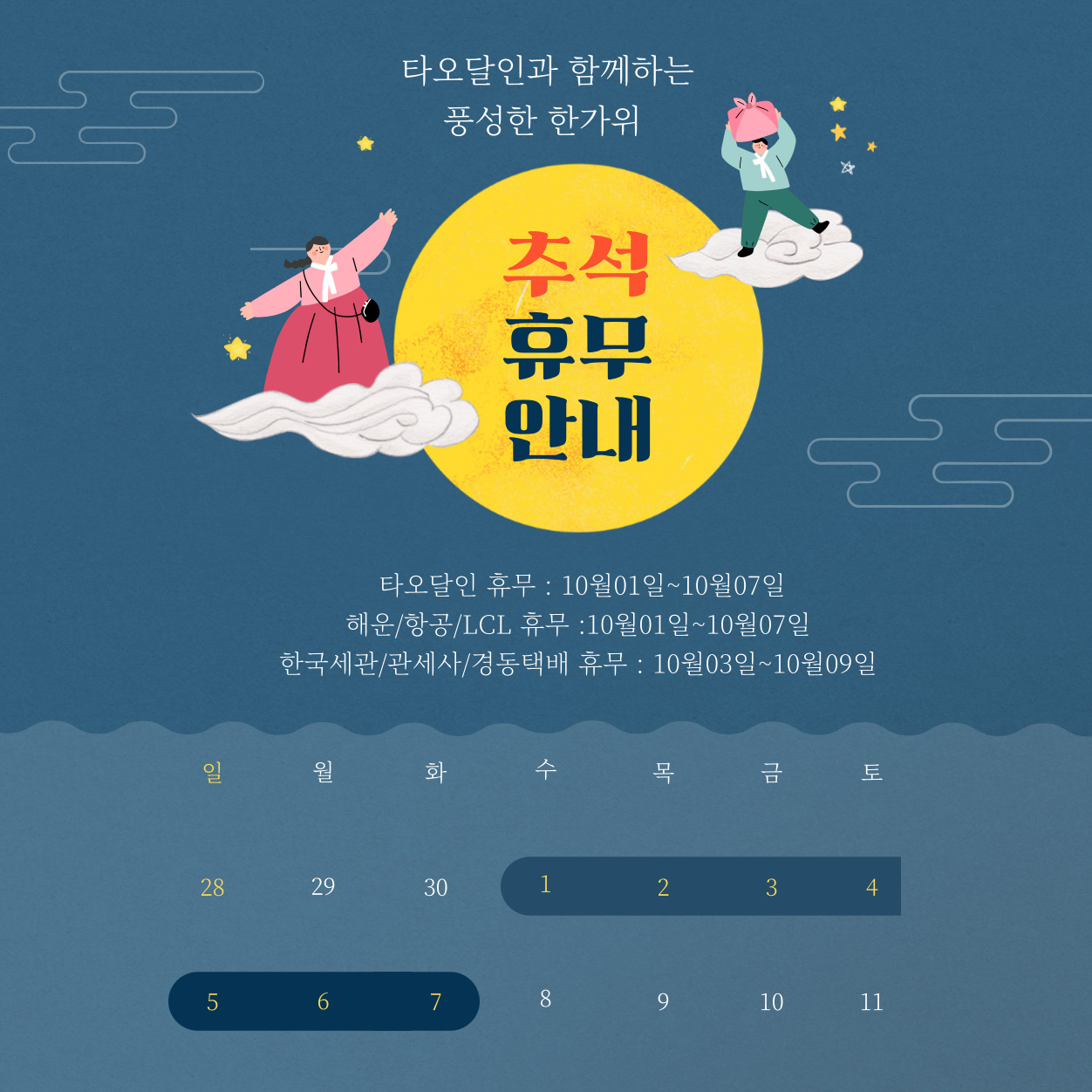 ▶해운/항공특송/LCL 휴뮤 : 10월1일~10월7일 까지